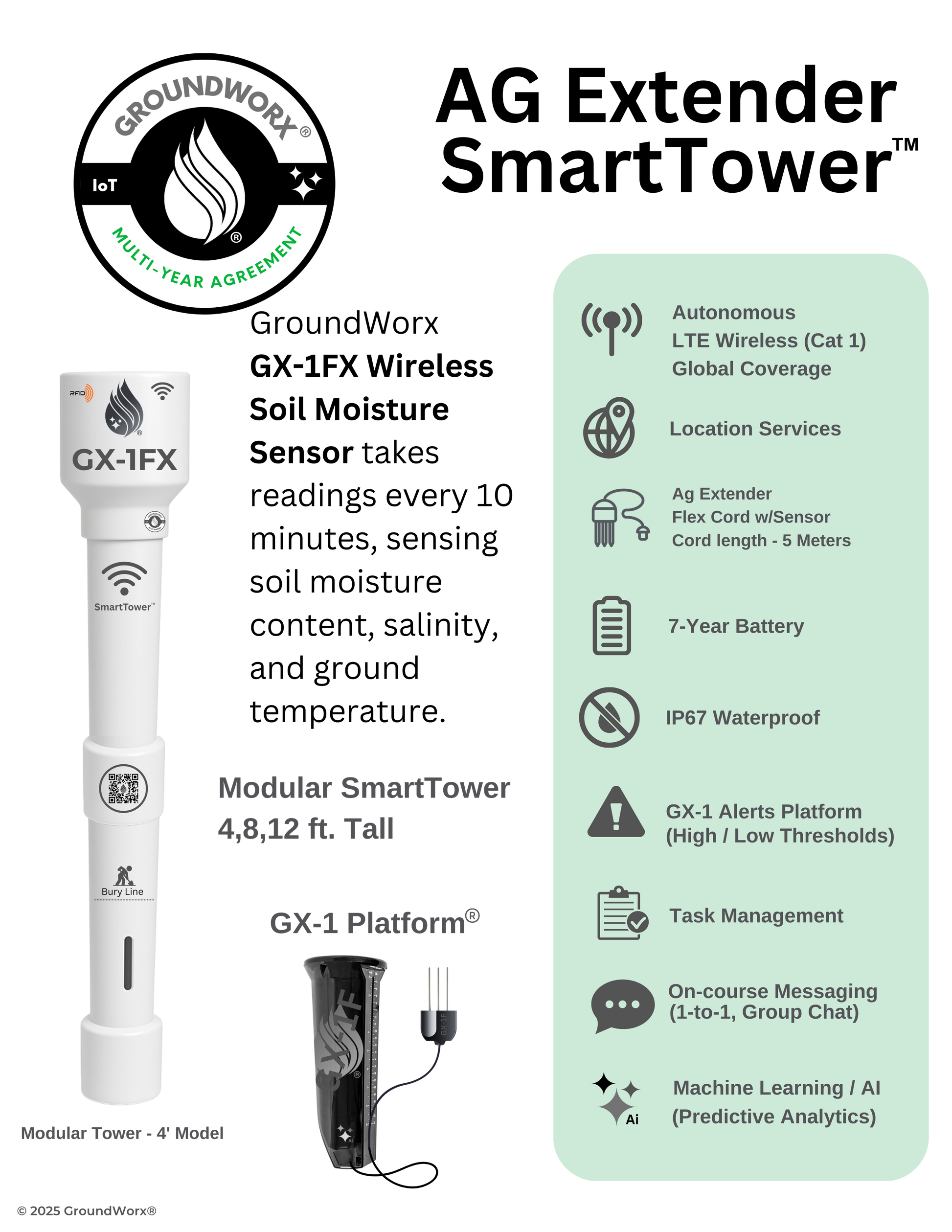 The GX-1 Platform is an advanced, scientific solution for monitoring soil conditions. With the GX-1FX (AG Extender) in-ground wireless sensor, you'll receive 144 daily readings on moisture, ground temperature, and salinity. This annual SaaS subscription optimizes turf and tree health and decreases watering by 25-35%.