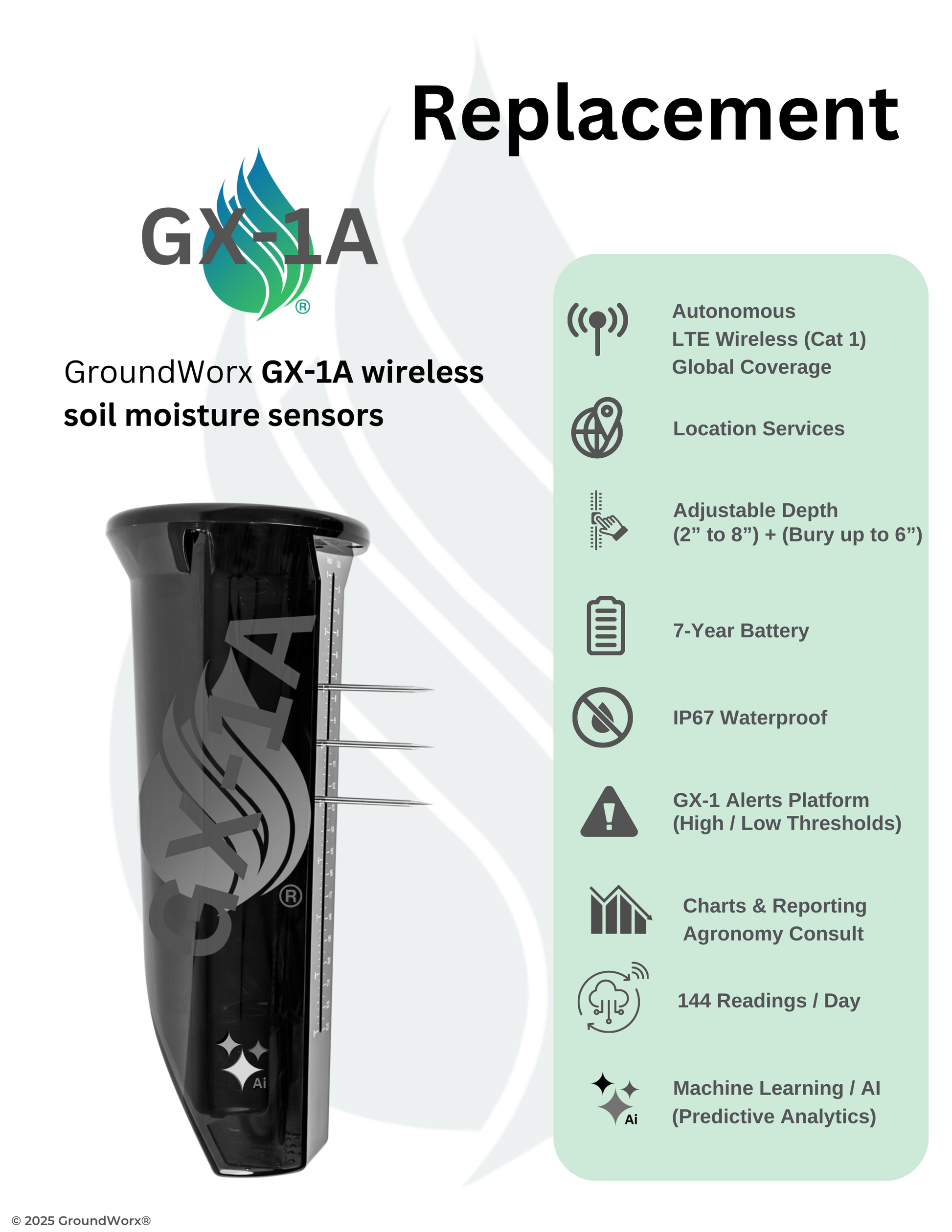 The GX-1A sensors deployed throughout the soil profile verify and contrast in-ground readings. The customer pays $850.00 per sensor to replace confirmed damaged sensors. The Annual SaaS remains unchanged, including access to the GX-1 Platform, myGroundWorx.com, and the groundworx app. USE PROMO CODE FREESHIP at checkout.