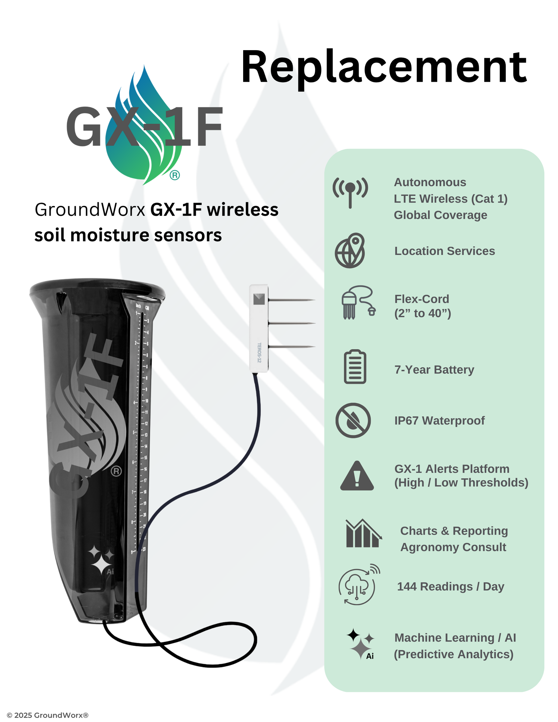 The GX-1F sensors deployed throughout the soil profile verify and contrast in-ground readings. The customer pays $850.00 per sensor to replace confirmed damaged sensors. The Annual SaaS remains unchanged, including access to the GX-1 Platform, myGroundWorx.com, and the groundworx app. USE PROMO CODE FREESHIP at checkout.